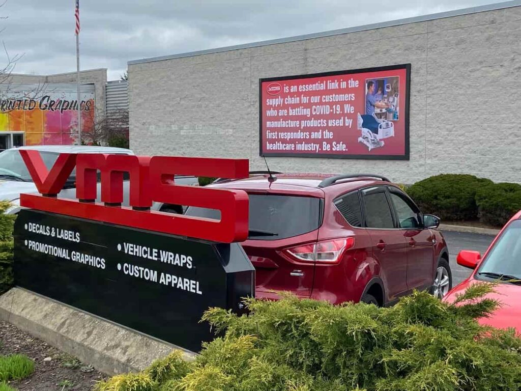As the day to day operations quickly changed and businesses across the country saw a drastic dip in revenue, VMS saw an opposite result: an increase in orders from our medical manufacturer customers. These customers were preparing for the inevitable need for medical equipment, unsure of when all production would halt. While one of our markets was busy (labels & decals), the other three (vehicle graphics, signs/banners, & apparel) came to a grinding halt. The VMS executive team had to come up with a solution to keep their 58 year old business going and their 135 workers employed.